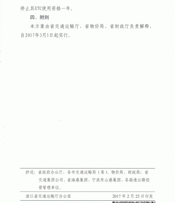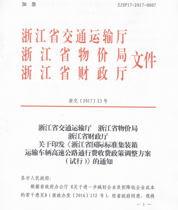 浙江省國際標(biāo)準(zhǔn)集裝箱運(yùn)輸車輛高速公路通行費(fèi)收費(fèi)政策調(diào)整方案(試行) 浙交[2017]23號