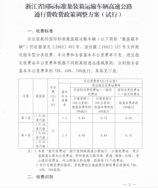 浙江省國際標(biāo)準(zhǔn)集裝箱運(yùn)輸車輛高速公路通行費(fèi)收費(fèi)政策調(diào)整方案(試行)