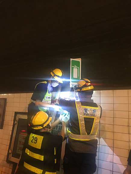 圖為維修人員在修復消防標志燈