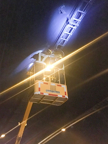 中午11:00,因流量過大,高速交警要求臨時開放被堵主車道。趁此空隙機會,中心隊伍暫撤到黃土嶺隧道管理所解決午餐,之后又馬不停蹄奔赴并集結在北洞口緊急停車帶,待重新封道后繼續(xù)跟進作業(yè),力爭在審批時間內做更多的維修??紤]到主車道燈具損壞不多,抽調一組登高車人員負責攝像頭檢修工作,而底下人員則負責修復更換消防、緊急電話等標志燈,每組人員都在與時間賽跑,忙的顧不上喝水。