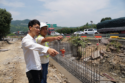 圖為工作人員巡查臺州南收費所鋼結構施工現(xiàn)場