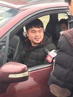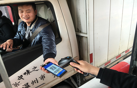 圖為臺(tái)州高速公路支付寶移動(dòng)支付通行費(fèi)第一輛車的車主接受媒體采訪