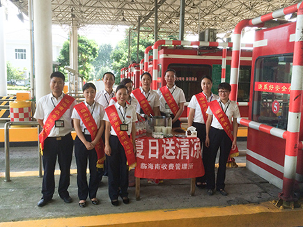 圖為工作人員合影 活動當(dāng)天,該所在車道安全島內(nèi)搭起臨時“便民服務(wù)臺”,不僅免費為司乘人員提供綠豆湯、礦泉水等消暑食品,還備足藿香正氣水、風(fēng)油精、清涼油、花露水等解暑降溫藥品?;顒又?,大家身披橫幅,面帶微笑,向途經(jīng)收費所的司機遞上一杯杯綠豆湯、一瓶瓶礦泉水。同時,大家還不忘宣傳行車安全注意事項,提醒司機朋友在高溫酷暑時節(jié)多注意安全。司機朋友們不時露出欣喜的笑容,連連稱謝。 臨海南收費所通過開展“夏日送清涼”活動,不僅給廣大司乘人員在酷暑中送去絲絲涼意和關(guān)心,更加促進了收費員與司乘人員之間的溝通交流,拉近距離,從而贏得了過往司乘人員的好評,塑造了良好的窗口形象。 陳瑩