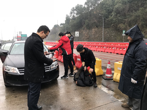 31日是春運(yùn)的前一天,下起了今年的第一場(chǎng)大雪。當(dāng)天10:30分左右,三號(hào)車道如往常一樣正常、有序,該車道正在檢查綠農(nóng)車。這時(shí)一輛牌照為浙JVIT6*黑色小轎車緩緩駛?cè)耄蝗辉撥嚰铀僬{(diào)整方向,想朝二號(hào)車道沖去。與此同時(shí)從它后方快速?zèng)_出一輛轎車檔在了該車前面,接著后方又沖出一輛黑色轎車,攔截在該車后方的去路。兩輛車上跳下幾個(gè)大漢,以迅雷不及掩耳之勢(shì),一擁而上干脆利落的將車內(nèi)三名犯罪嫌疑人控制。 當(dāng)班收費(fèi)員被這一幕驚呆了,不過(guò)迅速反應(yīng)過(guò)來(lái),啟動(dòng)應(yīng)急預(yù)案,呼叫監(jiān)控員,監(jiān)控員在監(jiān)控視頻中發(fā)現(xiàn)這個(gè)情況后,第一時(shí)間通知所長(zhǎng)。所長(zhǎng)孫明偉得知情況后立即趕赴現(xiàn)場(chǎng),確認(rèn)核實(shí)身份,并令當(dāng)班班長(zhǎng)第一時(shí)間聯(lián)系當(dāng)?shù)嘏沙鏊藢?shí)身份。在得到明確的答復(fù)后,工作人員立刻封閉該車道,為民警辦案提供方便,并打開備用車道正常收費(fèi)疏導(dǎo)過(guò)往車輛,組織人員疏散圍觀群眾避免車輛和人員停留過(guò)多影響民警辦案。