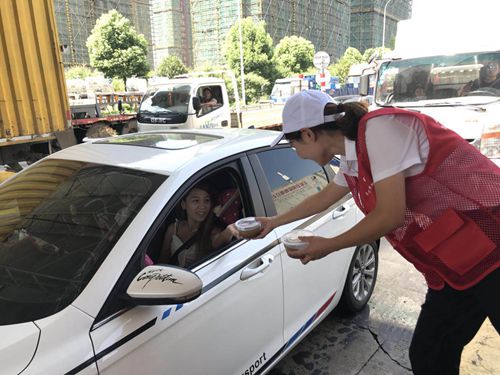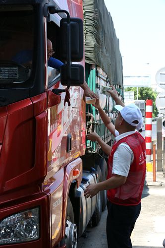圖為志愿者給過往司機(jī)遞上清涼飲品