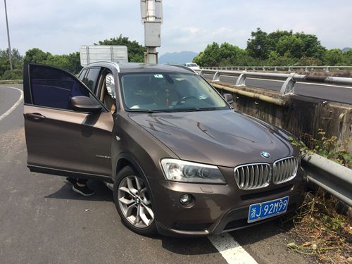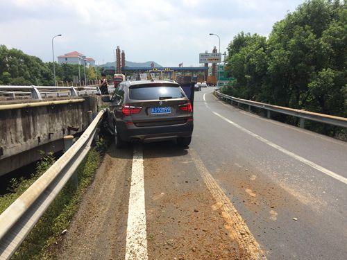 8月13日上午10:30分左右,臺州收費(fèi)所出口寧向匝道口有一輛黑色寶馬X3斜靠在護(hù)欄旁,其車頭左側(cè)因碰撞護(hù)欄而嚴(yán)重凹陷,左前輪胎報廢。 當(dāng)時,該所出口五號車道的欄桿發(fā)生故障,需要暫時關(guān)閉進(jìn)行維修。班長張海勇在內(nèi)廣場引導(dǎo)車輛時發(fā)現(xiàn)此起事故,走近細(xì)看,由于碰撞激烈該車前檔玻璃破裂,前排安全氣囊彈出,而車旁的兩個人驚恐未定不知所措。此時匝道口車流不斷,因駕駛員遲遲找不到三角牌,為避免二次事故的發(fā)生,張海勇在車后方指揮交通,并提醒車旁人員站在護(hù)欄外安全位置,同時報告指揮中心事故車的位置和損傷情況。
