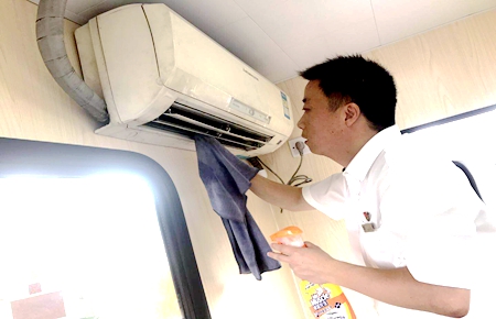圖為黨員杜佳清洗空調