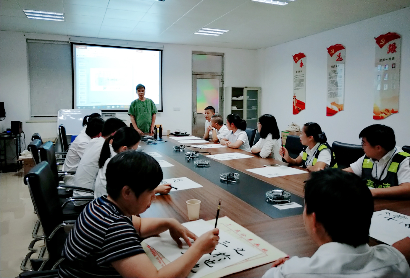 圖為培訓(xùn)現(xiàn)場(chǎng) 本次培訓(xùn)內(nèi)容主要針對(duì)書(shū)法作品注意要點(diǎn)展開(kāi)。課堂上,陳士春以風(fēng)趣灑脫、通俗易懂的授課方式,對(duì)書(shū)法作品注意要點(diǎn)進(jìn)行深入講解,并在白板上、紙上進(jìn)行書(shū)寫(xiě)演示,詳細(xì)地講解漢字的起筆與收筆,筆畫(huà)之間的搭配,同時(shí)手把手指導(dǎo)學(xué)員們書(shū)寫(xiě)的技巧和注意事項(xiàng),與大家互動(dòng)交流,為大家在學(xué)習(xí)書(shū)法過(guò)程中遇到的困難答疑解惑。陳士春鼓勵(lì)大家堅(jiān)持每天練習(xí),書(shū)法一定要持之以恒,