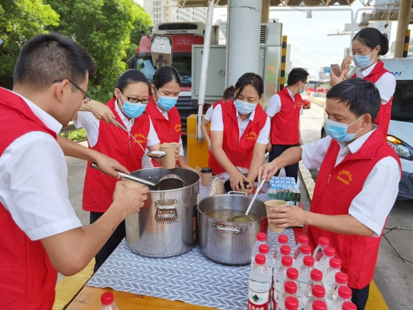 在溫嶺西收費所進出口處,志愿者們身穿紅馬甲,面帶微笑地向途經(jīng)的司乘們遞上一杯杯蓮子湯、紅棗綠豆湯,并溫馨提醒司乘注意疲勞駕駛。 近日,連續(xù)高溫,驕陽似火,為進一步延伸文明服務,緩解司乘人員暑熱疲勞,臺州高速溫嶺西收費所組織志愿者積極開展“炎炎夏日送清涼”活動,為行駛在路上的廣大司乘送上一份夏日的清涼。