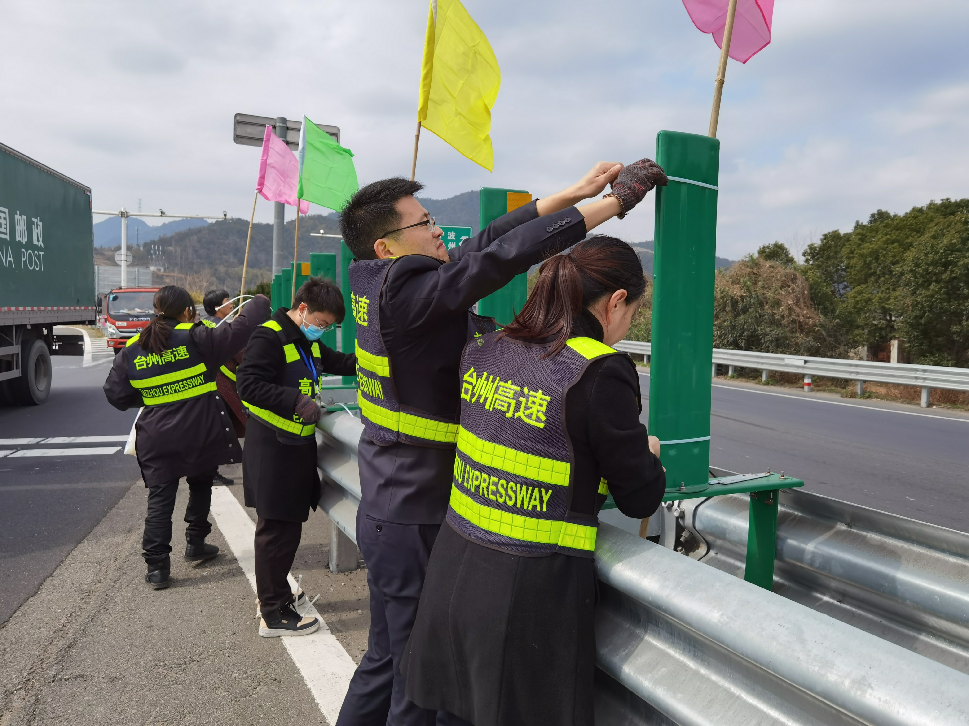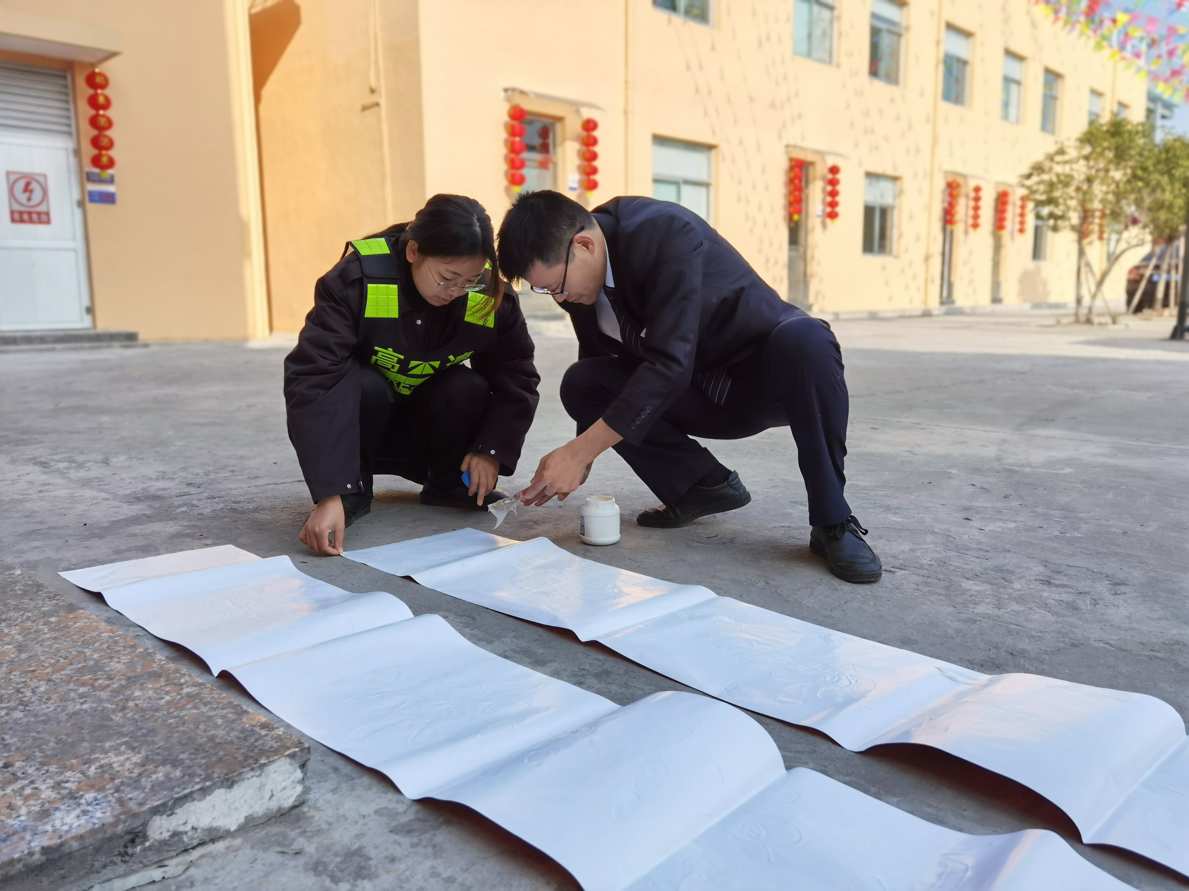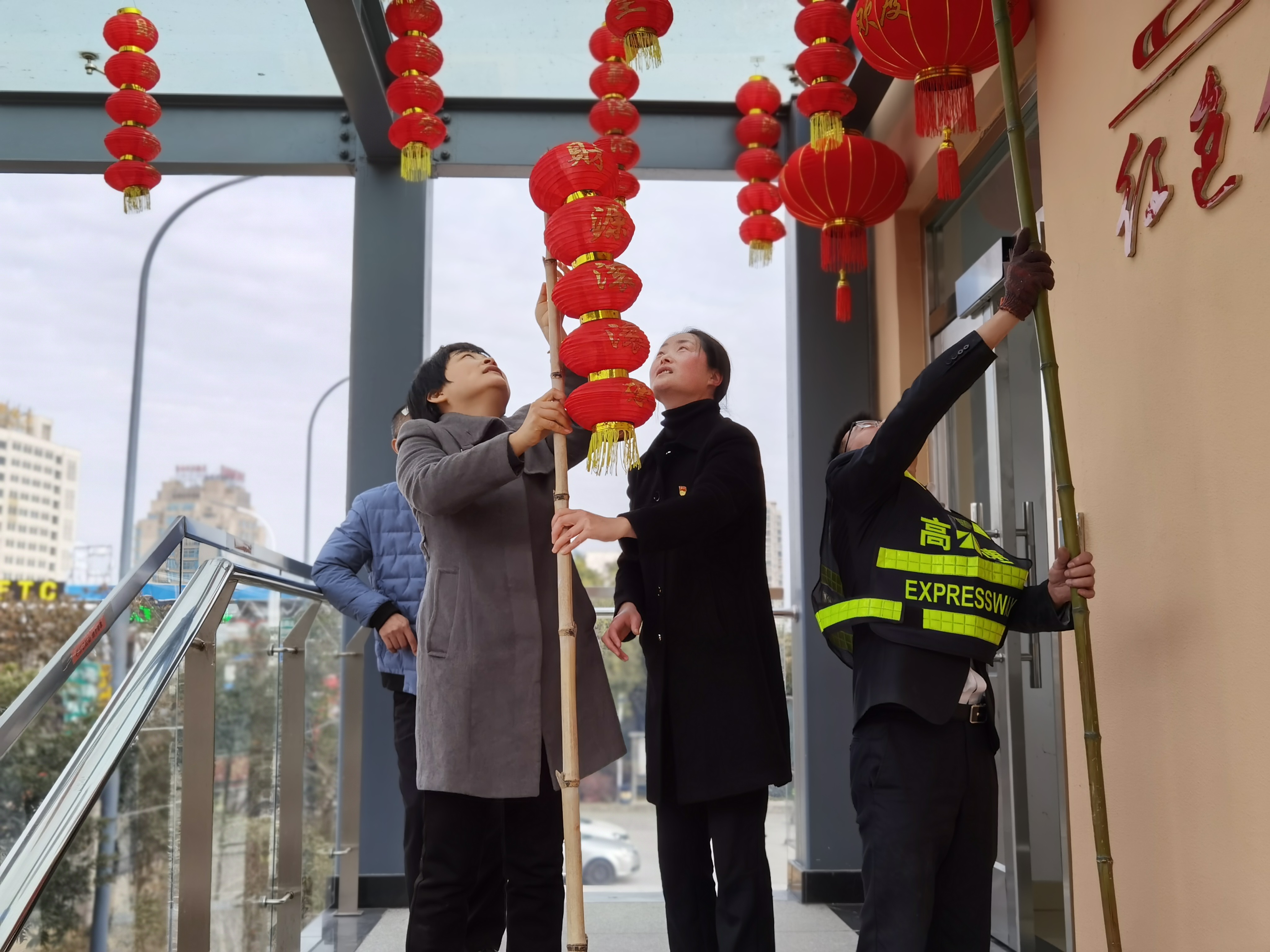 大家分工合作,搬梯子、遞春聯(lián)、貼膠帶、校正高低。在站所內(nèi)每個(gè)角落都掛上了紅彤彤的燈籠;收費(fèi)區(qū)域內(nèi)廣場(chǎng)兩邊的欄桿上扎著一面面彩旗。一幅幅精致喜慶的對(duì)聯(lián)、“?!弊?,一串串三角彩旗,一個(gè)個(gè)大紅燈籠把整個(gè)收費(fèi)站所點(diǎn)綴得處處洋溢著濃厚的節(jié)日氛圍,“年味”十足,讓在站員工和過往司乘朋友感受到新年的喜慶氛圍和“家”的溫暖。