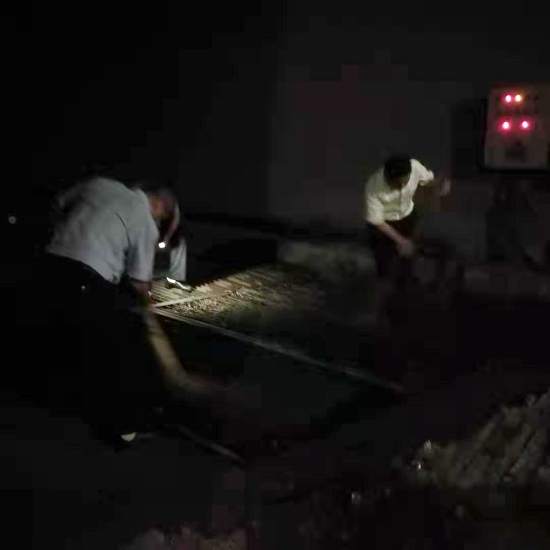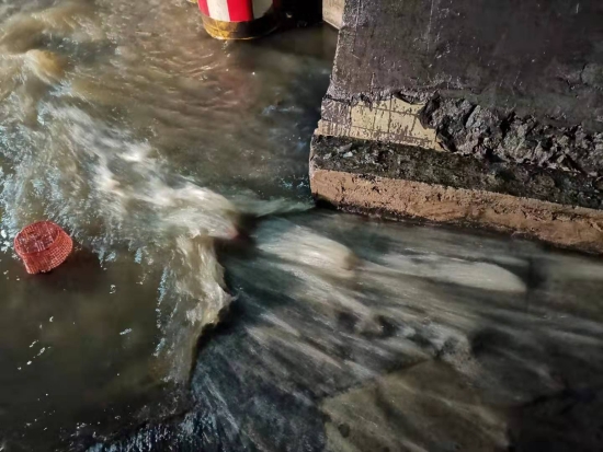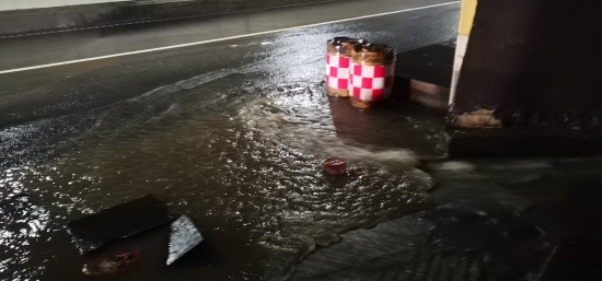 圖為車道水流 當晚19:12分,黃土嶺隧道所中控員徐彤霞發(fā)現(xiàn)寧向隧道主車道路面出現(xiàn)積水,如不及時處置,路面濕滑會讓過往車輛打滑,嚴重影響隧道的安全暢通。為了杜絕安全隱患,管理所立即啟動防汛應急方案,中控員第一時間在管理群發(fā)送現(xiàn)場圖片,并在同一時間通知執(zhí)勤隊與監(jiān)控中心。 執(zhí)勤隊員不顧狂風暴雨趕赴現(xiàn)場,19:19分,斜井現(xiàn)場山上倒灌入隧道的水嘩嘩直流,儲水池水流急促,執(zhí)勤隊員立即分工合作,一組在主車道擺放安全錐采取防護措施,并利用沙包,堵住排水溝壁,使水盡量不往外滲,及時避免了積水對隧道內(nèi)行車造成的安全隱患。一組檢查潛水泵是否正常運行,查看積水入侵的原因、排水溝通暢情況。