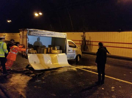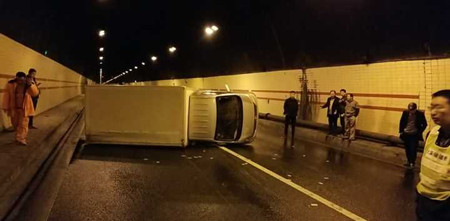 事后經(jīng)了解,因當(dāng)天小雨,路面濕滑,該小貨車在剛進(jìn)隧道不久,司機(jī)發(fā)現(xiàn)跟車太近,急踩腳剎車,致使小貨車不受控制地翻車,并導(dǎo)致油箱漏油。所幸該事故并未造成人員傷亡和較大損失。