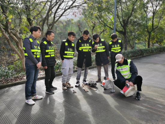 圖為陶文輝在教樂清公司員工如何進(jìn)行水帶操作 本次培訓(xùn)對(duì)隧道預(yù)警流程、二帶連接及執(zhí)勤隊(duì)在平時(shí)巡邏、預(yù)警、處理事故中如何確保自身安全等進(jìn)行重點(diǎn)講解。執(zhí)勤隊(duì)長(zhǎng)帶領(lǐng)隊(duì)員們?cè)诠芾硭賵?chǎng)進(jìn)行模擬主線卡口、事故拋錨車預(yù)警封道操作,樂清公司員工觀摩之后也進(jìn)行實(shí)際操作,孫鵬詳細(xì)講解擺放隔離錐應(yīng)注意事項(xiàng),每一隔離錐的間隔位置、巡邏車后方擺放的安全距離,事故處理之后,收隔離錐應(yīng)注意的安全動(dòng)作。陶文輝為樂清公司員工演示“二帶連接”,并對(duì)水帶的甩、接、收每一動(dòng)作盡可能詳細(xì)仔細(xì)地進(jìn)行解說示范。