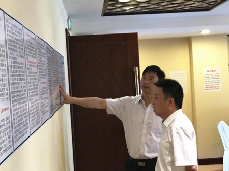 圖為集團副總經(jīng)理陳保衛(wèi)正在檢查標語標識 陳保衛(wèi)認真查看了仙居收購點從入口到辦理點的指示標牌,并向工作人員詢問了該收購點所在酒店的知名度。經(jīng)工作人員介紹,仙居東方大酒店是仙居當?shù)厝朔浅J煜さ木频辏€未發(fā)生過股東找不到收購點而打電話詢問的事。陳保衛(wèi)聽后面帶微笑,連連點頭。 走到收購點內(nèi),員工正在給幾名股東辦理咨詢業(yè)務,陳保衛(wèi)轉(zhuǎn)身查看起收購點內(nèi)等待區(qū)、標語標識等布置。當看到貼在墻上的“市國資委主任徐豪就臺州高速股權(quán)集中和優(yōu)化的有關(guān)問題接收臺州各大媒體的采訪提問”內(nèi)容時,陳保衛(wèi)認為該招貼畫制作簡潔、一目了然,可以較好地展示公司形象,回答股東疑問。他要求收購點工作人員再接再厲、主動作為,以熱情飽滿的服務態(tài)度,貫徹落實好各項工作部署,共同努力完成股權(quán)集中和優(yōu)化工作。 眼下,該收購點股權(quán)集中和優(yōu)化工作已步入正軌,各項工作運行平穩(wěn)正常,當前正在為9月8日仙居縣國有資產(chǎn)投資集團有限公司第一個轉(zhuǎn)讓股權(quán)宣傳事宜進行多方協(xié)調(diào)。 張波