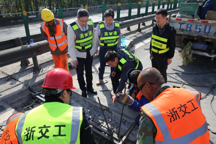 隨后,在伸縮縫型鋼安裝現(xiàn)場(chǎng),陳文波撿起鑿除的碎渣,查看被鑿除的舊伸縮縫情況。公司所轄路段屬于軟土路基,且有91座橋梁,由于運(yùn)行時(shí)間已20余年,部分橋梁伸縮縫破損較為嚴(yán)重,如何維修橋梁伸縮縫和橋頭跳一直是個(gè)老大難問(wèn)題。在橋梁伸縮縫修補(bǔ)現(xiàn)場(chǎng),因?yàn)橹剀?chē)的碾壓,部分伸縮縫已經(jīng)磨損嚴(yán)重,所在的混凝土路面只能借助鑿巖機(jī)進(jìn)行作業(yè)。
