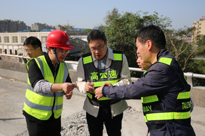 10月31日上午,臺(tái)州高速集團(tuán)董事長(zhǎng)陳文波在總工程師江輝的陪同下,趕赴甬臺(tái)溫高速公路溫州方向黃土嶺隧道、橋梁維修加固工程施工現(xiàn)場(chǎng),檢查施工進(jìn)展情況。
