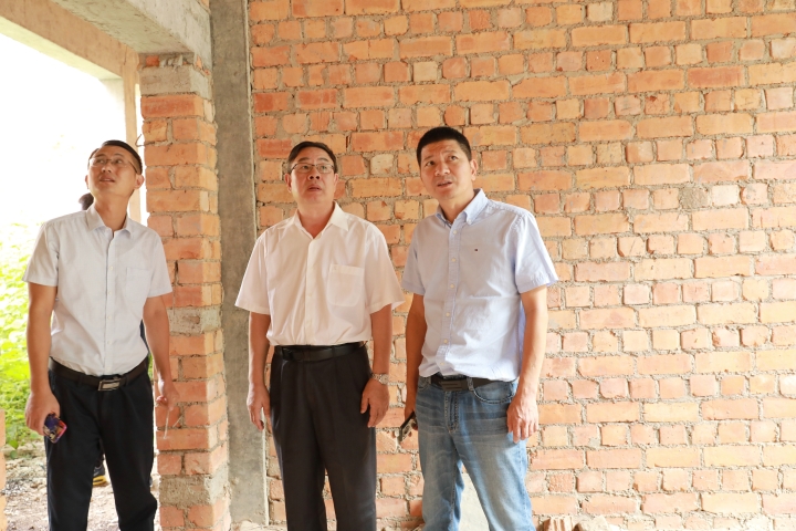 圖為陳文波一行在淡竹景區(qū)查看茅草山莊外立面建設(shè)情況