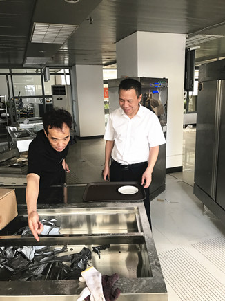 圖為公司副董事長、總經(jīng)理張建平于7月1日到大樓檢查指導(dǎo)食堂整改工作
