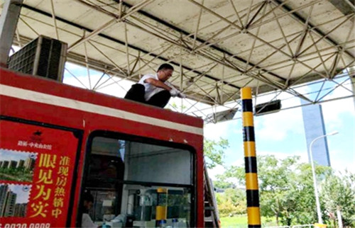 圖為收費所員工正在加固崗?fù)た照{(diào)外機