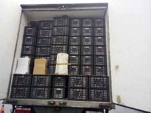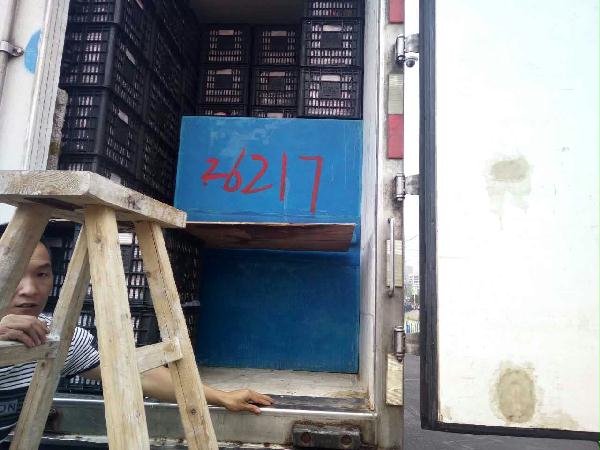 圖為被處罰的車輛 早上10點40分左右,這輛運蘋果的貨車駛?cè)胧召M站的一號崗?fù)?,司機師傅說自己運的是蘋果,根據(jù)公司規(guī)定,綠農(nóng)車檢查必須開車門檢查貨物。憑著多年的檢查經(jīng)驗,當(dāng)班班長童軍偉發(fā)現(xiàn)這輛綠農(nóng)車有問題,覺得重量遠遠不夠,可能不符合“綠農(nóng)”免費政策。果不其然,車廂中“深藏玄機”,左右兩側(cè)各有一排玻璃鋼魚箱,這就給檢查增加了難度。當(dāng)班班長要求司機師傅把最后兩排箱子拿掉,想檢查玻璃魚缸,然而這個司機極其不配合,還惡意刁難工作人員,說什么也不搬蘋果。