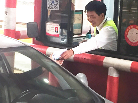 圖為工作人員向過往司機(jī)發(fā)放施工傳單