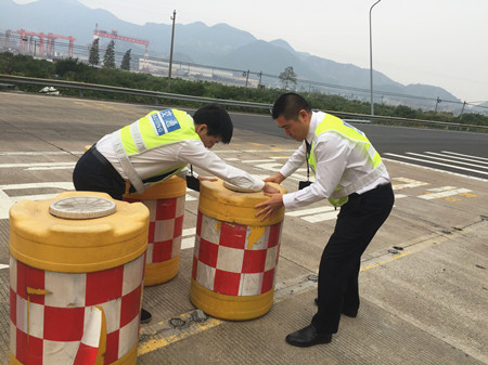 公司沿線四個收費(fèi)站平穩(wěn)實(shí)現(xiàn)路面養(yǎng)護(hù)施工期入口轉(zhuǎn)換 因G15沈海高速臺州段于2017年10月28日零時(shí)至11月16日24時(shí)封閉施工,施工期間,公司所轄路段溫嶺西、臺州南、臺州、臨海南實(shí)行交通管控,公司沿線各收費(fèi)站、工程和交警、臺州市公路局等部門單位緊密配合,多措并舉,平穩(wěn)實(shí)現(xiàn)收費(fèi)站入口轉(zhuǎn)換。 為配合公司道路養(yǎng)護(hù)和黃土嶺右洞改造施工,公司征費(fèi)系統(tǒng)提前在各收費(fèi)站入口LED屏上發(fā)布施工信息,連夜安排趕印50000份施工公告發(fā)放至四個收費(fèi)所,提醒過往司乘人員提前規(guī)劃施工期間的出行路線。