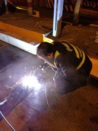 到了現(xiàn)場,隊員發(fā)現(xiàn)該車道輪檢器鐵板螺孔由于不斷摩擦并逐漸變大,導致整顆螺栓脫離底下固定螺座,加之當天是春節(jié)高速免費第一天,車輛經(jīng)過時車速都較快,直接將整塊鐵板帶離底座。如果不及時對鐵板進行加工恢復,不僅不能保護下面的輪檢器,而且還有可能造成車輛爆胎??沙σ谷考庸S都已關門,如果讓廠家發(fā)貨至少也要好幾天。正在兩難之際,中心副經(jīng)理葉俊想到將鐵板與底座邊緣直接焊死的臨時應急方法,待節(jié)后再向廠家定制或重新購買。 方案有了,大家兵分兩組,一組去中心倉庫拿電焊機、電焊條等設備,一組待在原地清理鐵底下方於泥等雜物,為隨后的電焊工作做準備。設備到位后,葉俊一手操起電焊罩,一手熟練的將電焊條點在了鐵板與底座邊緣之間,經(jīng)過近一個小時的處理,輪檢鐵板與地面底座牢牢地固定在一起,再也不用被飛馳而過的車輛帶離。 項寅曉