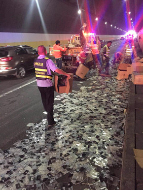 兩起事故的接連發(fā)生使救援工作緊張。2分鐘后,執(zhí)勤隊火速趕到了事故現場,為了以最短時間恢復正常通行,隊長謝永濱決定兵分兩組,一組自己帶隊對第二起事故立即進行處理,讓輕微擦傷的三輛事故車先撤離現場,在下個出口等待交警處置,并向監(jiān)控中心通知需拖車前來施救,與此同時加強預警,快速疏導交通。另一組由執(zhí)勤隊員跑步前進查看事故現場,了解車輛情況。經查看,該貨車因爆胎導致撞車,所幸側翻事故未造成人員傷亡。在各部門的通力配合下,一個小時后,事故現場清理完畢,隧道恢復了正常通行。