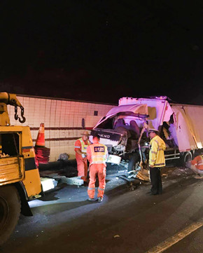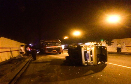 這輛“始作俑者”的車輛由于司機疲勞駕駛,不慎撞擊隧道壁而引發(fā)側翻,雖然該車內無人員受傷,可是跟隨其后的拖掛車就沒那么幸運。拖掛車司機看到前方出狀況,當即采取緊急制動,剎得太急又致使后方小貨車追尾,導致該車車頭嚴重受損,司機的手臂受了傷,運輸的鋁塊也撒了一地。