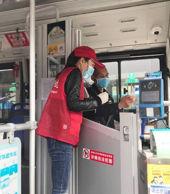 3月18日上午,臺州高速計財部職員毛譯聆早早就到站,一一戴好口罩、護目鏡、一次性手套,提前3分鐘走上所跟的108路班車。一路上,看見有乘客上車,她便等在車門前,量體溫、引導(dǎo)年輕人掃碼自行登記資料,幫助老年人實名登記身份信息,“安檢”通過后讓乘客有序上車,并禮貌勸導(dǎo)乘客間隔而坐,降低病毒感染的風險。