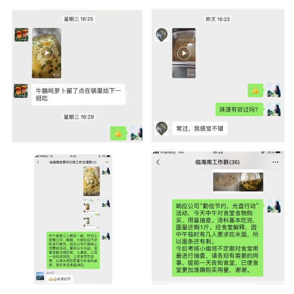 臨海南收費(fèi)所不只是單單把宣傳標(biāo)語掛在墻上,擺在桌上。更把節(jié)約舉措落實(shí)到具體行動中。為了不浪費(fèi)食材,行政人員提前安排一周菜單,并統(tǒng)計(jì)用餐人數(shù),規(guī)劃食材數(shù)量,食堂工作人員按照人數(shù)采購當(dāng)天食材控制成本,并將每餐燒好的菜拍成視頻上傳食堂交流群,以更好地關(guān)注食堂動態(tài),從源頭把控菜量與伙食的品質(zhì),每周還不定期抽查食堂,查看剩余量。