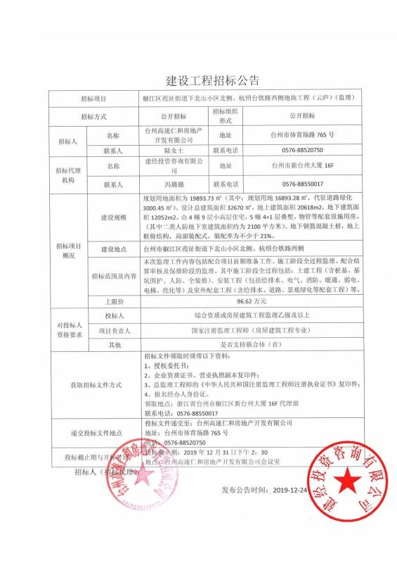 椒江區(qū)葭沚街道下北山小區(qū)北側(cè)、杭紹臺(tái)鐵路西側(cè)地塊工程(云廬)招標(biāo)公告