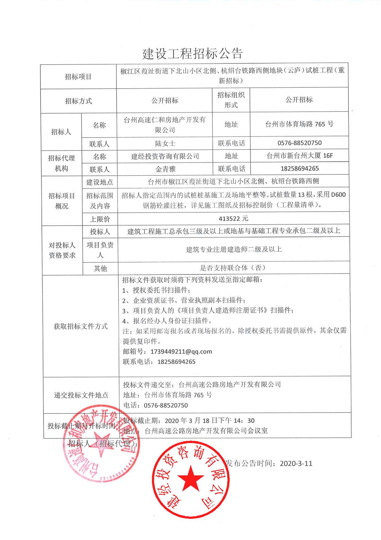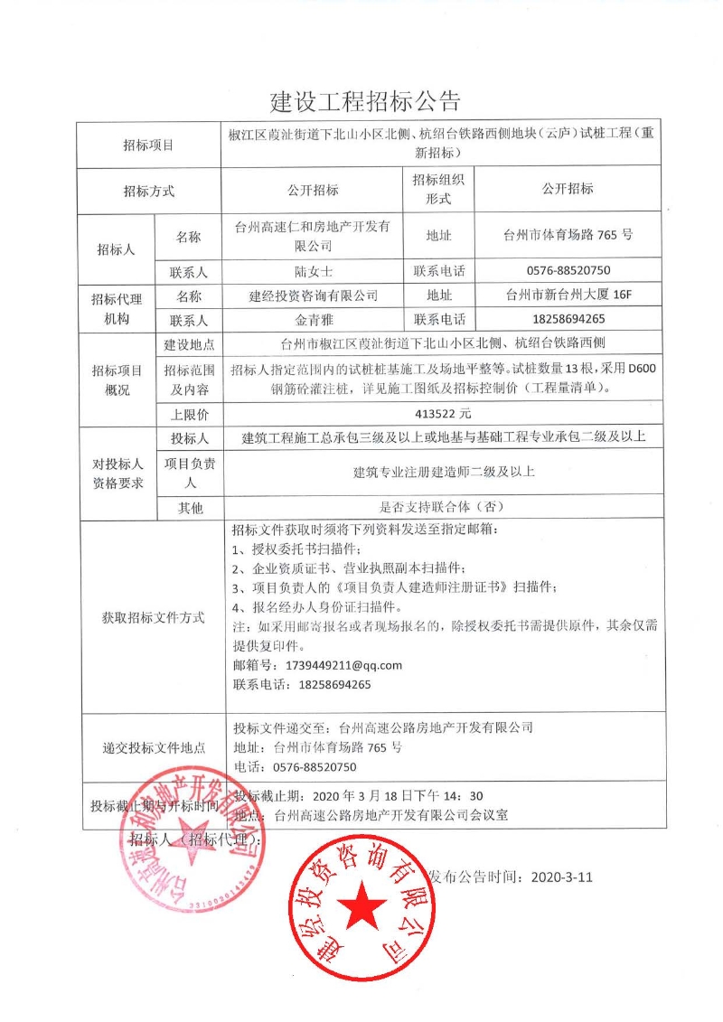 椒江區(qū)葭沚街道下北山小區(qū)北側(cè)、杭紹臺鐵路西側(cè)地塊(云廬)試樁工程(重新招標)公告