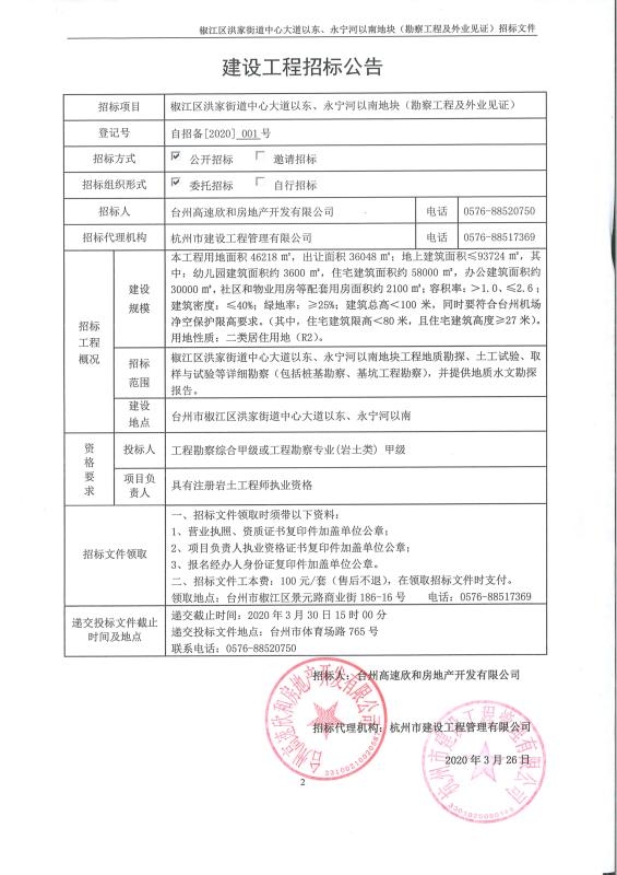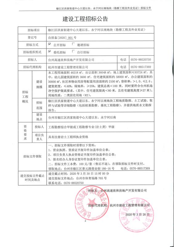 椒江區(qū)洪家街道中心大道以東、永寧河以南地塊(勘察工程及外業(yè)見證)工程招標公告