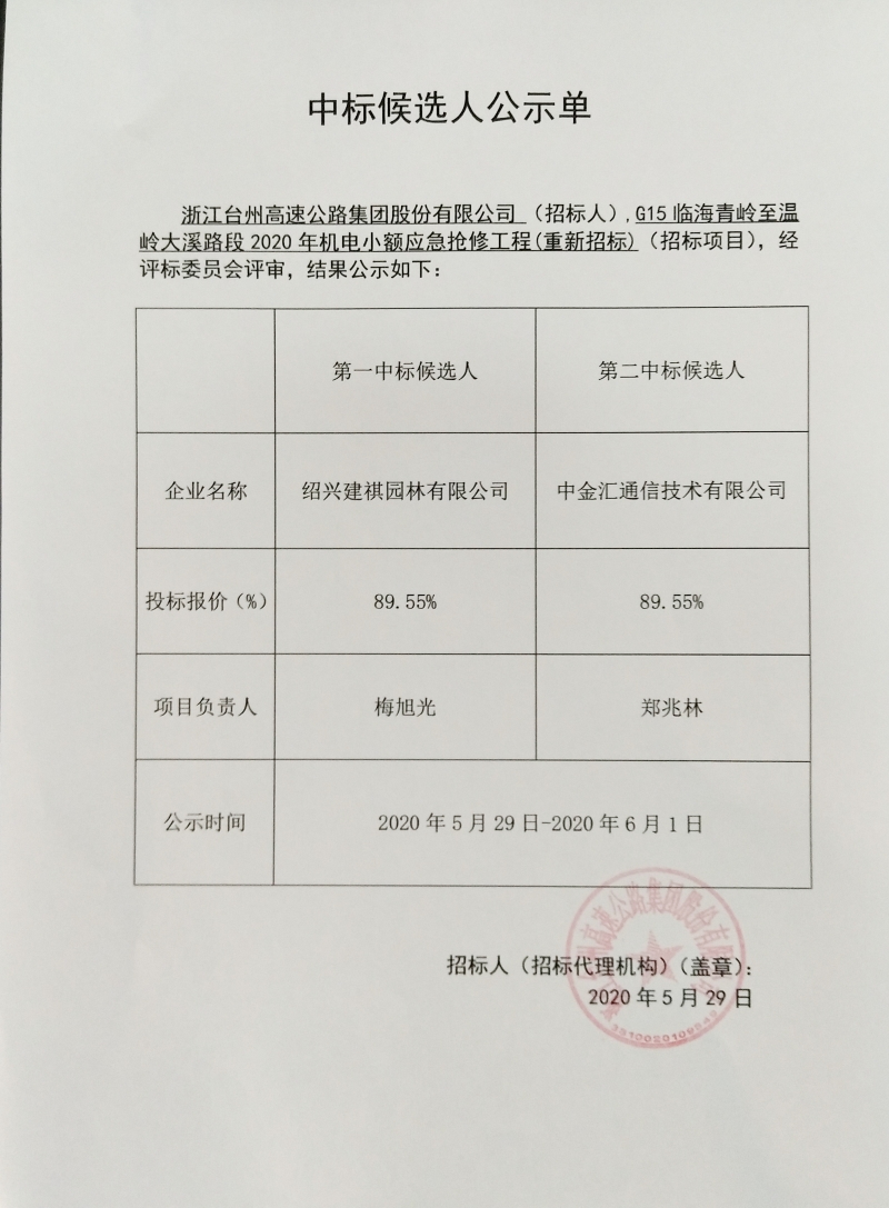 G15臨海青嶺至溫嶺大溪路段2020年機電小額應(yīng)急搶修工程(重新招標)中標候選人公示單