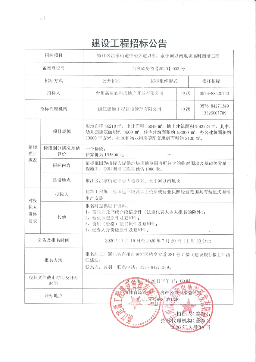 椒江區(qū)洪家街道中心大道以東、永寧河以南地塊臨時圍墻工程