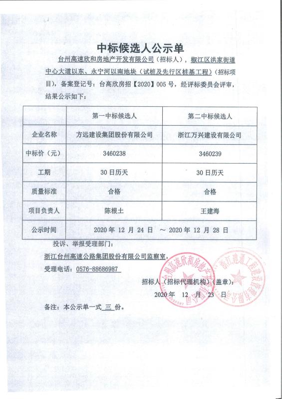椒江區(qū)洪家街道中心大道以東、永寧河以南地塊(試樁及先行區(qū)樁基工程)中標(biāo)候選人公示單