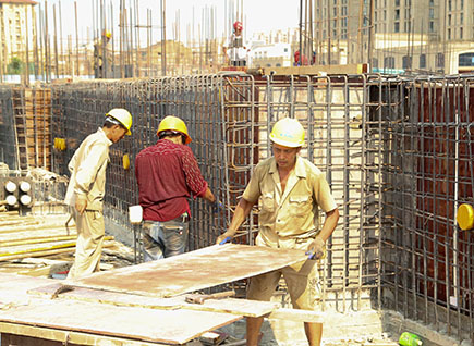 上圖為工人冒著高溫在文鼎苑工地上忙碌作業(yè)