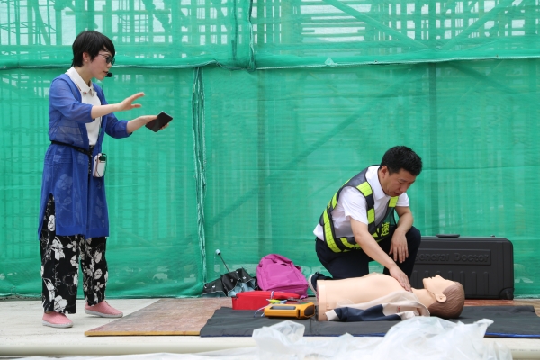圖為活動人員參加心肺復(fù)蘇實操演練 此次演練的第二項重頭戲是心肺復(fù)蘇術(shù)培訓,建筑工地多為臨時工棚且露天作業(yè),受臺風影響較大,心肺復(fù)蘇對于遭遇意外的施工人員來說如同救命稻草。高速集團安保部邀請了臺州職業(yè)技術(shù)學院副教授李美芬到演練現(xiàn)場進行心肺復(fù)蘇術(shù)培訓,李美芬詳細講解了心肺復(fù)蘇術(shù)和AED的理論知識、操作要領(lǐng)和具體方法,并規(guī)范熟練地進行了現(xiàn)場演示。隨后參與演練的各部門代表上臺學習實操,李美芬細心指導每一個動作,耐心講解每一個要點,教學效果顯著,有效提高了參演人員的急救技能。 防汛防臺無小事,安全生產(chǎn)有保障,房產(chǎn)集團下有多個在建工程項目,此次演練能夠進一步強化現(xiàn)場人員的防汛防臺意識,普及自救急救知識,提高工程管理人員、施工就業(yè)人員的防災(zāi)抗災(zāi)和應(yīng)急處置能力。 盧丹麗