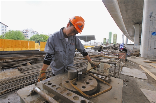 馬進學(xué)告訴記者,在鋼筋工這么多道工序里,將加工好的半成品鋼筋通過彎曲機制作成型是一道需要細心和耐心俱備的工序,無論是加工時的站位還是彎曲點的選擇都是對一個鋼筋工技藝的考驗,所以工作的時候必須集中精神格外小心。